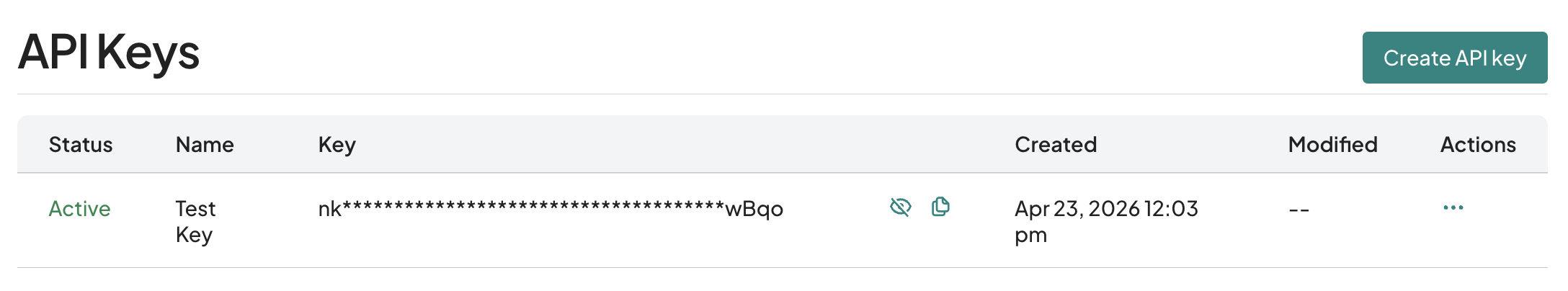 To manage an existing API key, click the three-dot menu under the Actions column next to the key. From there, you will see the following options: