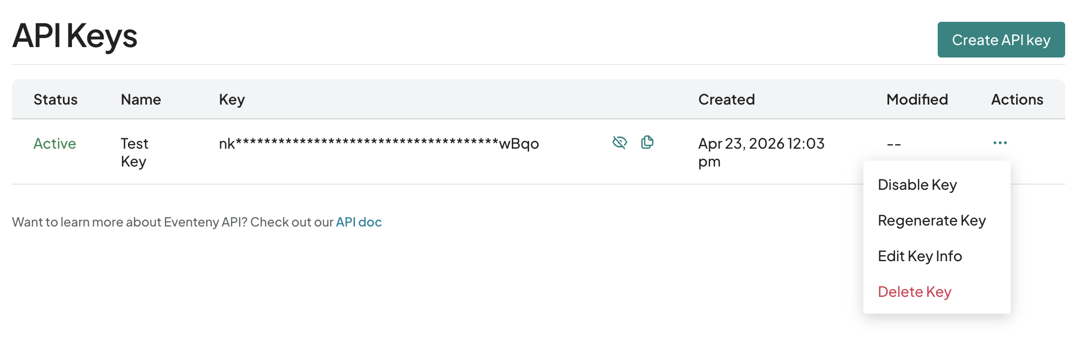 - Locate the API key you just created in the list. Confirm the Status shows as Active. If needed, click the eye icon to reveal the full key. Click the copy icon next to the key to copy it to your clipboard. Keep this key available, as it will be used in the next steps when connecting Eventeny to Zapier.